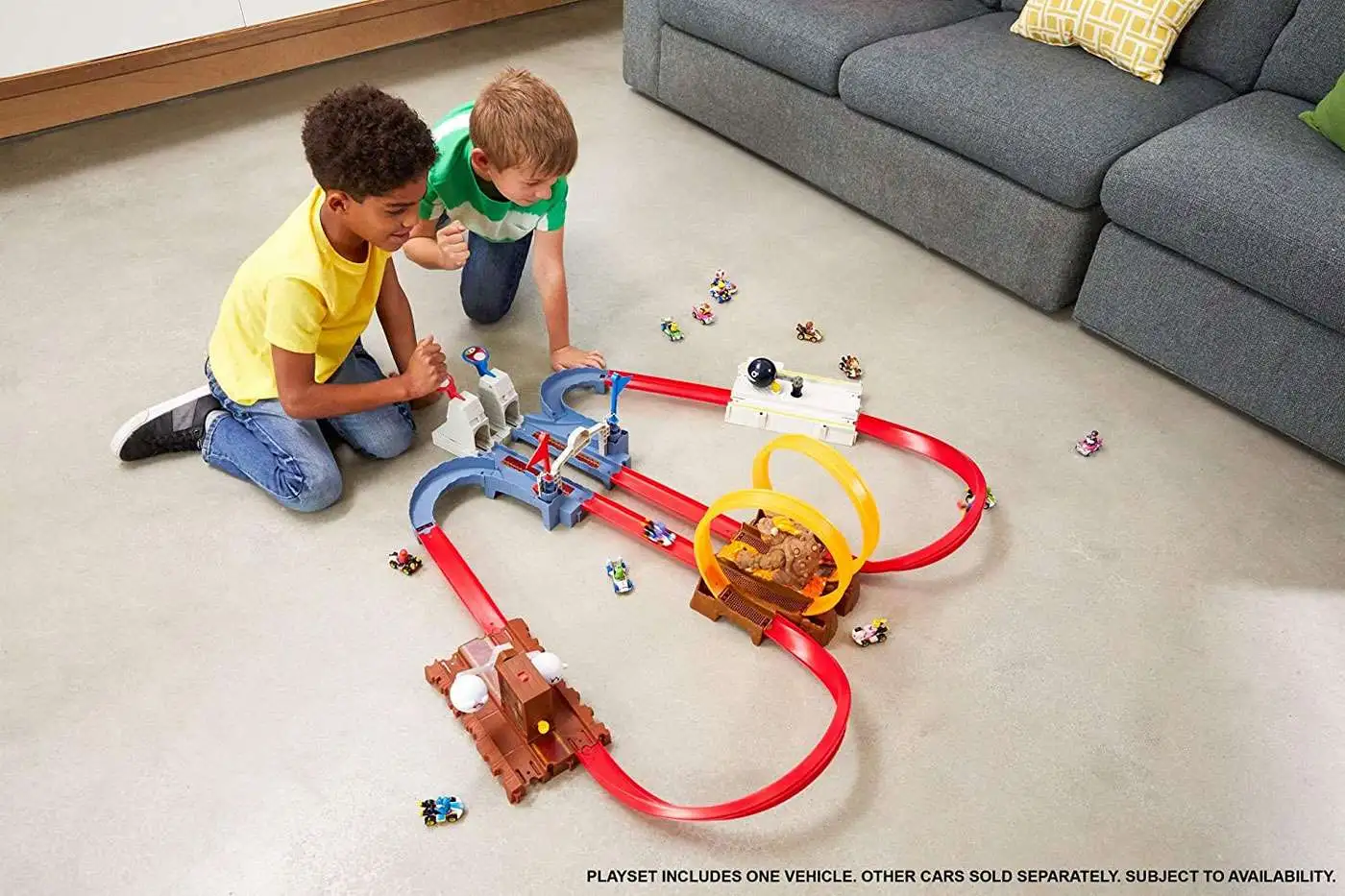 Kids can race their Hot Wheels Mario Kart replica vehicles to overcome the baddest Mario Kart nemesis Bowser! Side-by-side racing, counting lap flag and reconfigurability makes this track set a thrilling experience. Kids must dodge Bowser’s fists to get past him, around the banked turn, and complete 5 laps to beat their opponent and win the race. Includes one replica die-cast Yoshi vehicle. Up the level of difficulty and amp up challenges by reconfiguring the track and connecting the Piranha Plant, Thwomp Ruins track sets and the Mario Kart Circuit track set (sold separately).