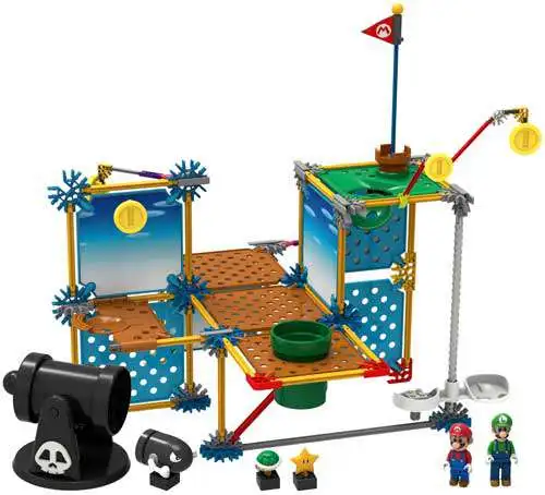 Go on a brand new adventure with Mario & Luigi as they battle Bullet Bill! Featuring K’NEX’s all new jump disk and launcher that allow Mario to run and jump, like he does in the game. Build Mario & Luigi and use the jump launchers to grab coins and the special spinning elevator rod to move between levels. Can you find the hidden coins on the back? Look out for Bullet Bill – shoot him out of his special cannon to defeat the Bros! Pop-up the goal flag and you’ve cleared the course! Green Shell and Star items also included. Combine your Cannon building set with the rest of the K’NEX Super Mario building set line to take Mario on an even BIGGER adventure! For ages 8+.