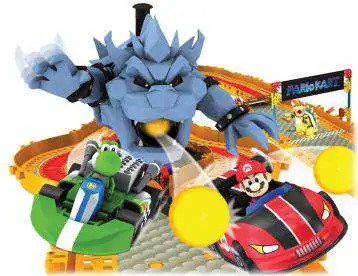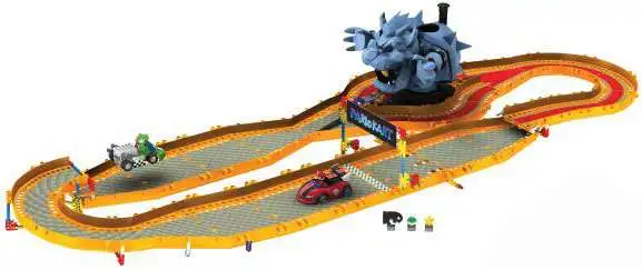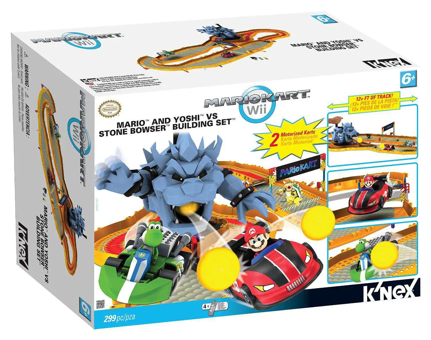 Bring Mario Kart Wii to life! Help Mario and Yoshi dodge huge fireballs as they race past the GIANT Stone Bowser from the Bowser’s Castle Track. The set includes the parts to build Mario and Yoshi, 2 Karts with super-fast, battery-powered motors, a Stone Bowser that shoots fireballs with slamming action and 3 collectible items from the game: Bullet Bill, a Star and a Green Shell! Also includes 30 pieces of buildable, interconnectable track that creates a closed loop – combine this set with other sets from the Mario Kart Wii Series to build even bigger tracks!