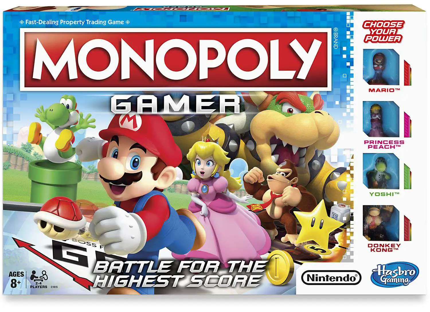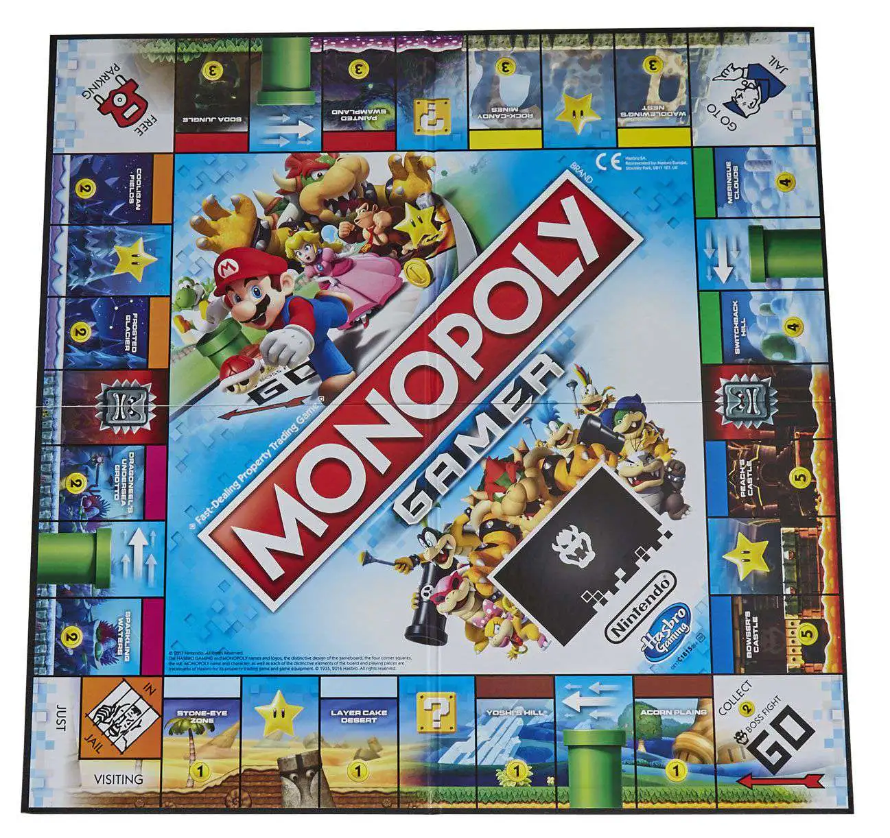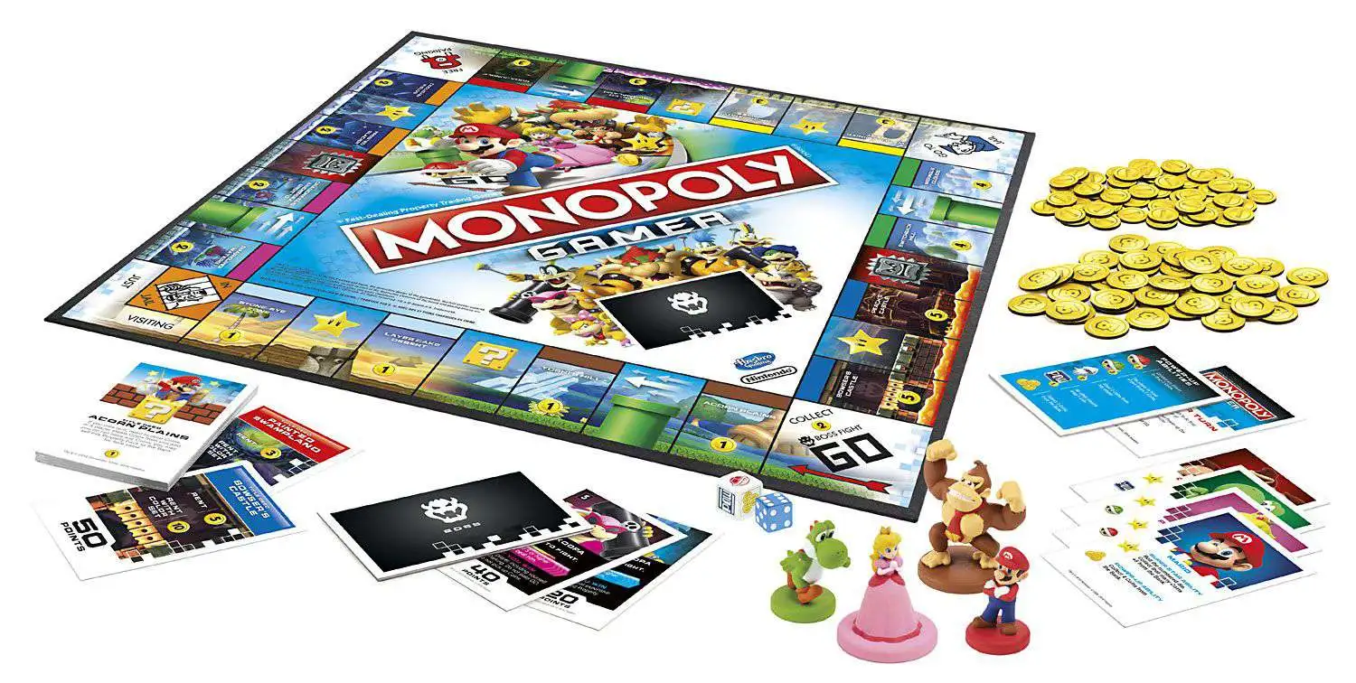 It’s the Monopoly game with a Nintendo twist as it joins forces with beloved Nintendo video game characters. Instead of standard Monopoly tokens, the game features Super Mario characters, each with their own special powers within gameplay. Play as Mario, Princess Peach, Yoshi, or Donkey Kong. Finish the game by defeating Bowser at the end! It’s not just about money in this game; players earn points by buying Properties, collecting Coins, and beating Bosses. The player with the highest score wins the game. TM and Copyright 2017 Nintendo. The Hasbro Gaming, Parker Brothers, and Monopoly names and logos, the distinctive design of the gameboard, the four corner squares, the Mr. Monopoly name and character, as well as each of the distinctive elements of the board and playing pieces are trademarks of Hasbro for its property trading game and game equipment.