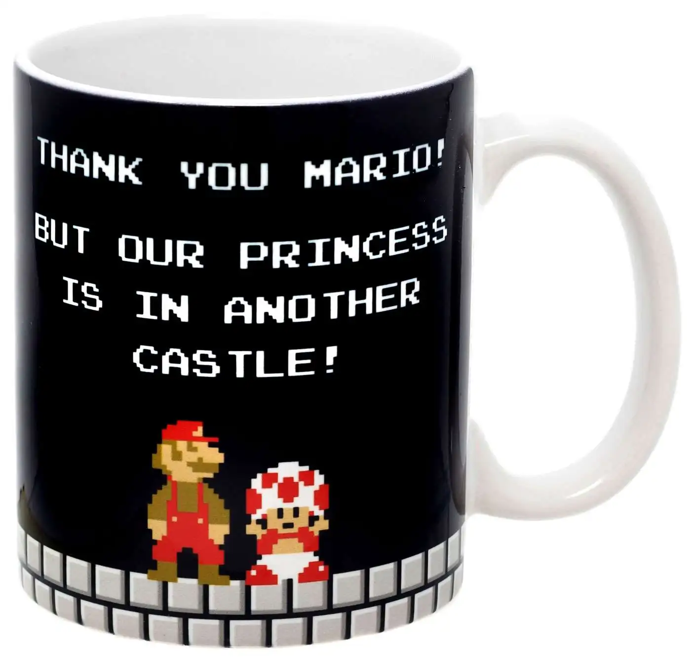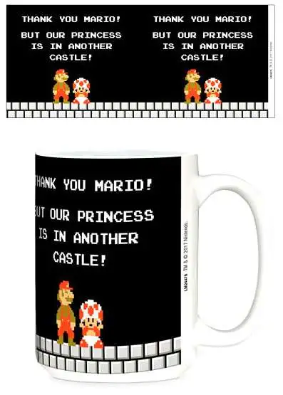 Officially licensed ceramic Super Mario Bros. coffee mug. This mug comes in black and features a Thank You Mario game screen on both sides.
