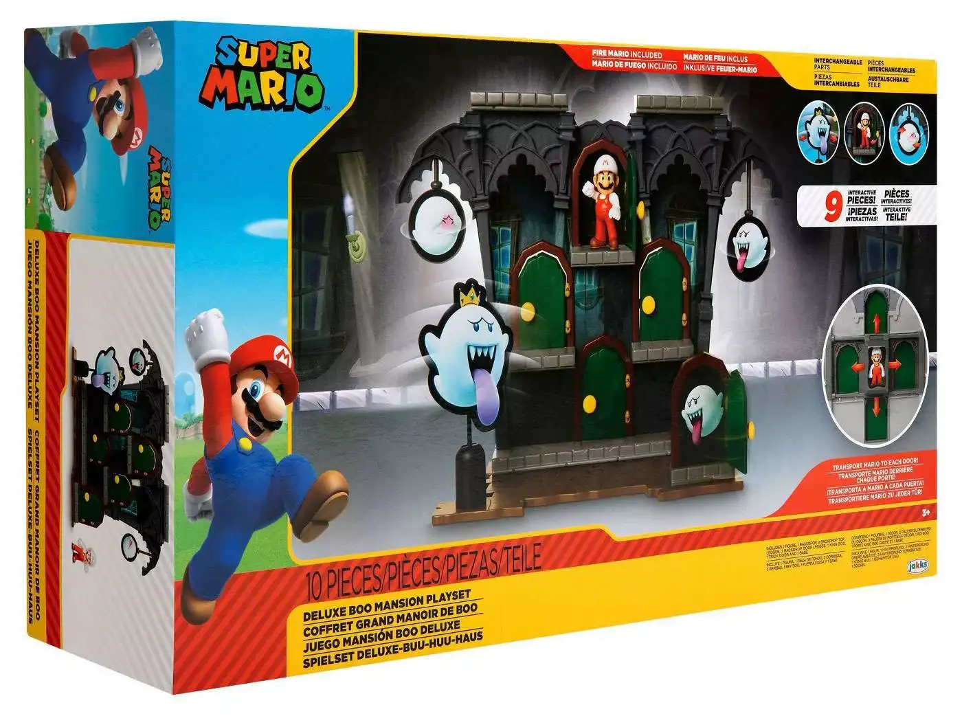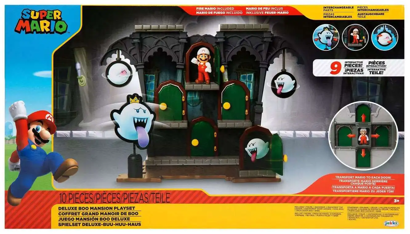 Nintendo launched its first console, the Nintendo Entertainment System, in North America in 1985 and with it, introduced the popular Super Mario Bros. franchise. Mario has since gone on to star in many gaming adventures, becoming the pop-culture icon he is today. Along with his friends Luigi, Peach, Yoshi, and Toad, this classic video game hero has an enduring appeal for fans of all ages! The Deluxe Boo Mansion Playset is haunted by boos that Mario must avoid in order to get through, just like in the game! Included in the playset are interactive pieces with feature mechanisms and a two and half inch Fire Mario figure. There are four functioning doors Mario can enter one door and secretly using the lift in the back of the playset, Mario can re-appear in any of the 3 remaining doors. Dont be fooled by the trick door where a boo will appear ready to attack, while King Boo sways side to side, protecting the mansion. This playset works with most two and a half inch figures.