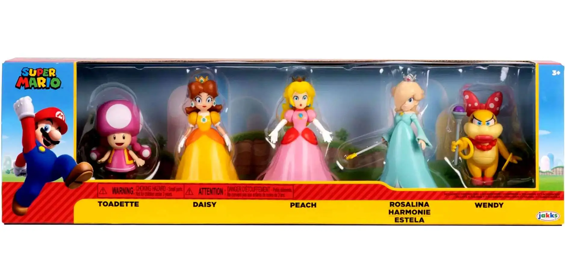 Expand your Super Mario collection with this Princess Peach Multipack 5 piece figure set! This ensemble includes Princess Peach, Rosalina, Daisy, Toadette, and Wendy Koopa. These authentic and poseable figures have multiple points of articulation and extraordinary details. Add to your collection today!